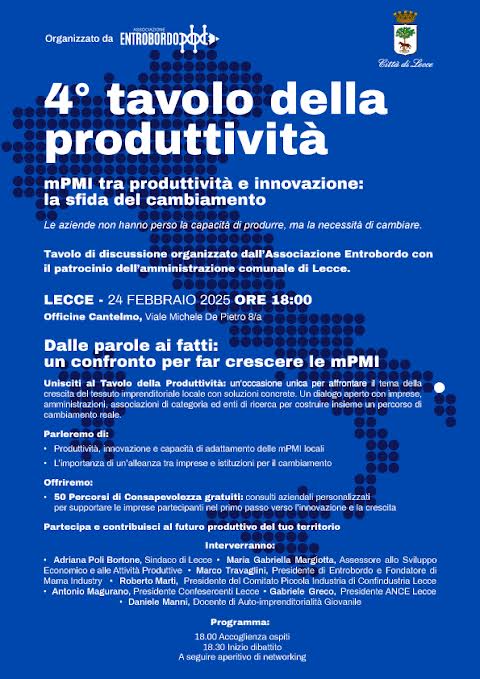 Dopo le tappe di Terni, L’Aquila e Fiumicino, il Tavolo della Produttività arriva a Lecce, con un incontro dedicato a innovazione, crescita e sviluppo delle micro, piccole e medie imprese (mPMI). L’evento, organizzato dall’Associazione Entrobordo, con il patrocinio dell’amministrazione comunale, riunirà istituzioni, associazioni di categoria e imprenditori locali per affrontare le principali sfide del tessuto produttivo e delineare soluzioni concrete per il futuro dell’economia locale.