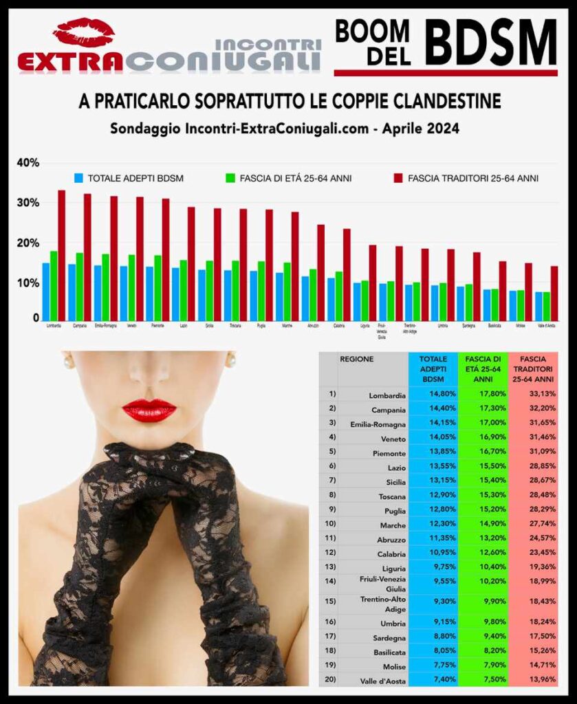 «In Italia gli “adepti” sono 6,7 milioni» sintetizza Alex Fantini, fondatore di Incontri-ExtraConiugali.com, il portale numero uno in Italia per le avventure extraconiugali, che in uno studio sulle tendenze sessuali condotto questo mese ha rilevato un notevole incremento delle pratiche BDSM ed ha elaborato un profilo identificativo dei praticanti-tipo.